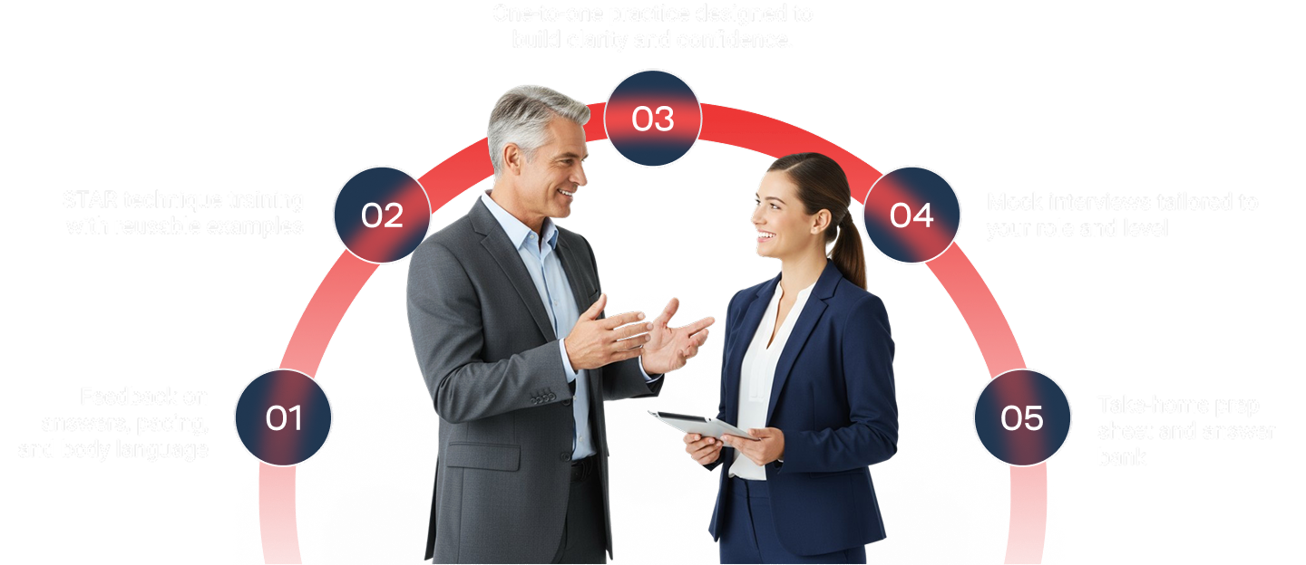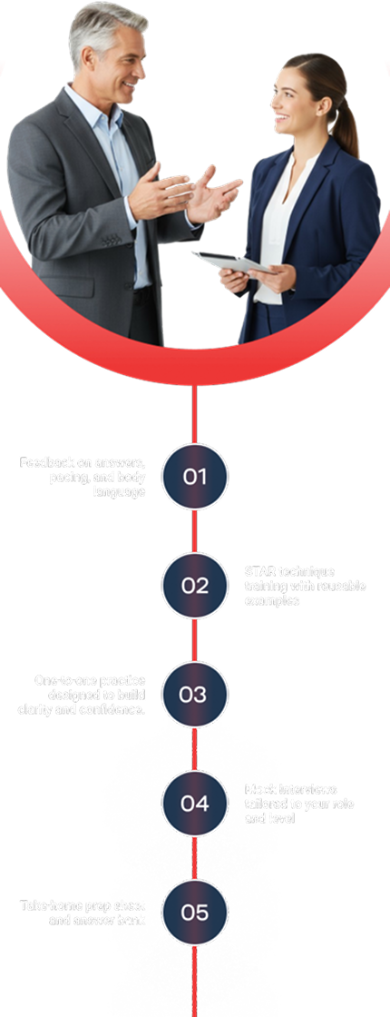 Show up with confidence, not rehearsed lines.Interviews aren’t about memorizing answers — they’re about telling your story with clarity. Our one-to-one coaching helps you turn nerves into confidence and conversations into offers.